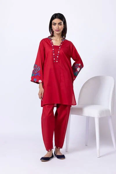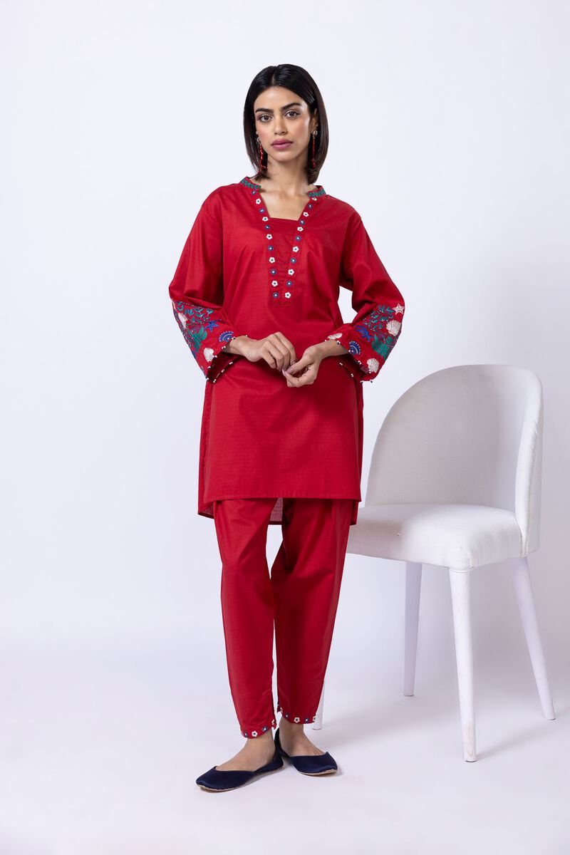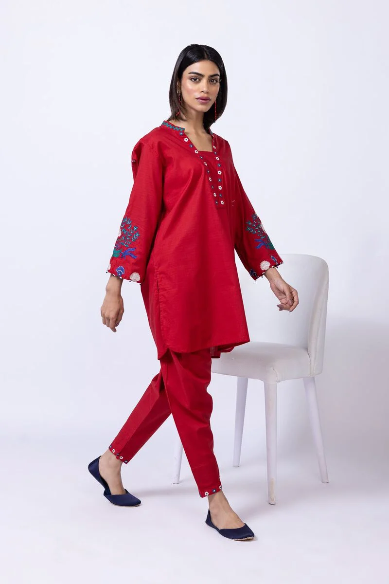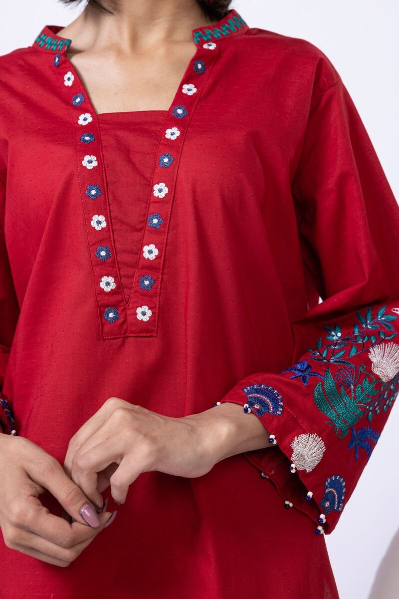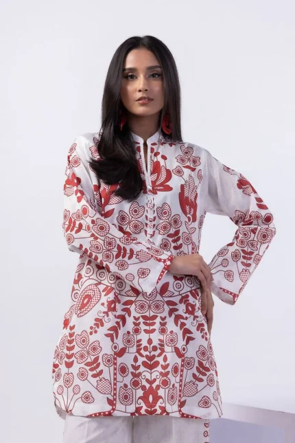 - Description: A short embroidered kurta featuring full sleeves, a band collar and a rounded hem.